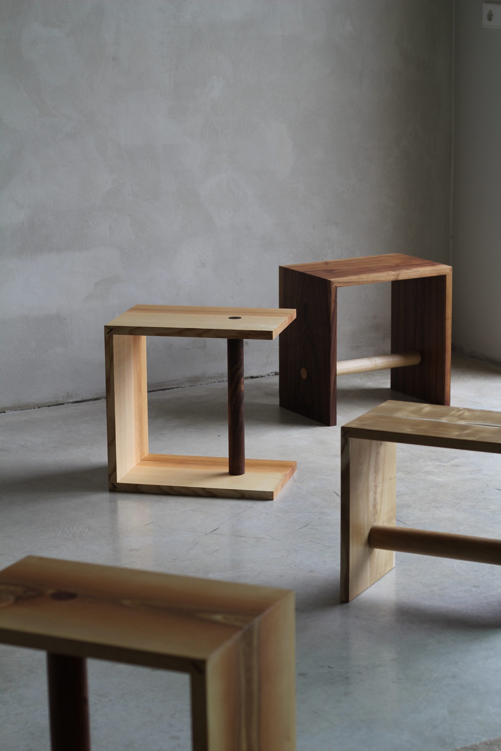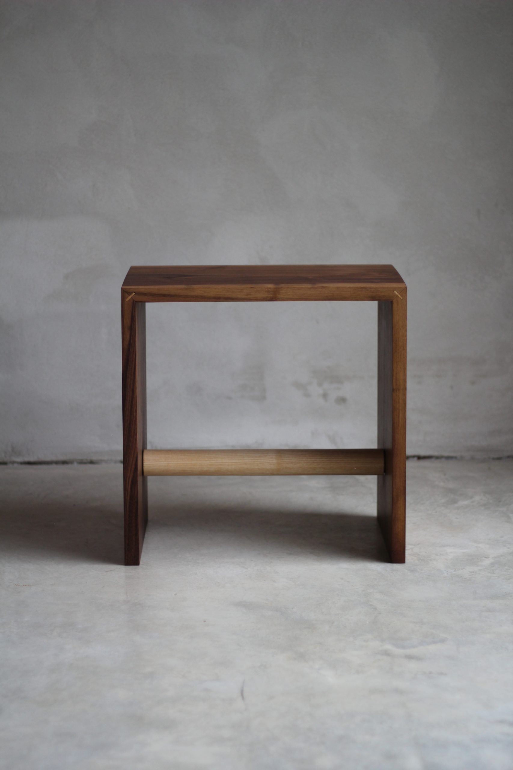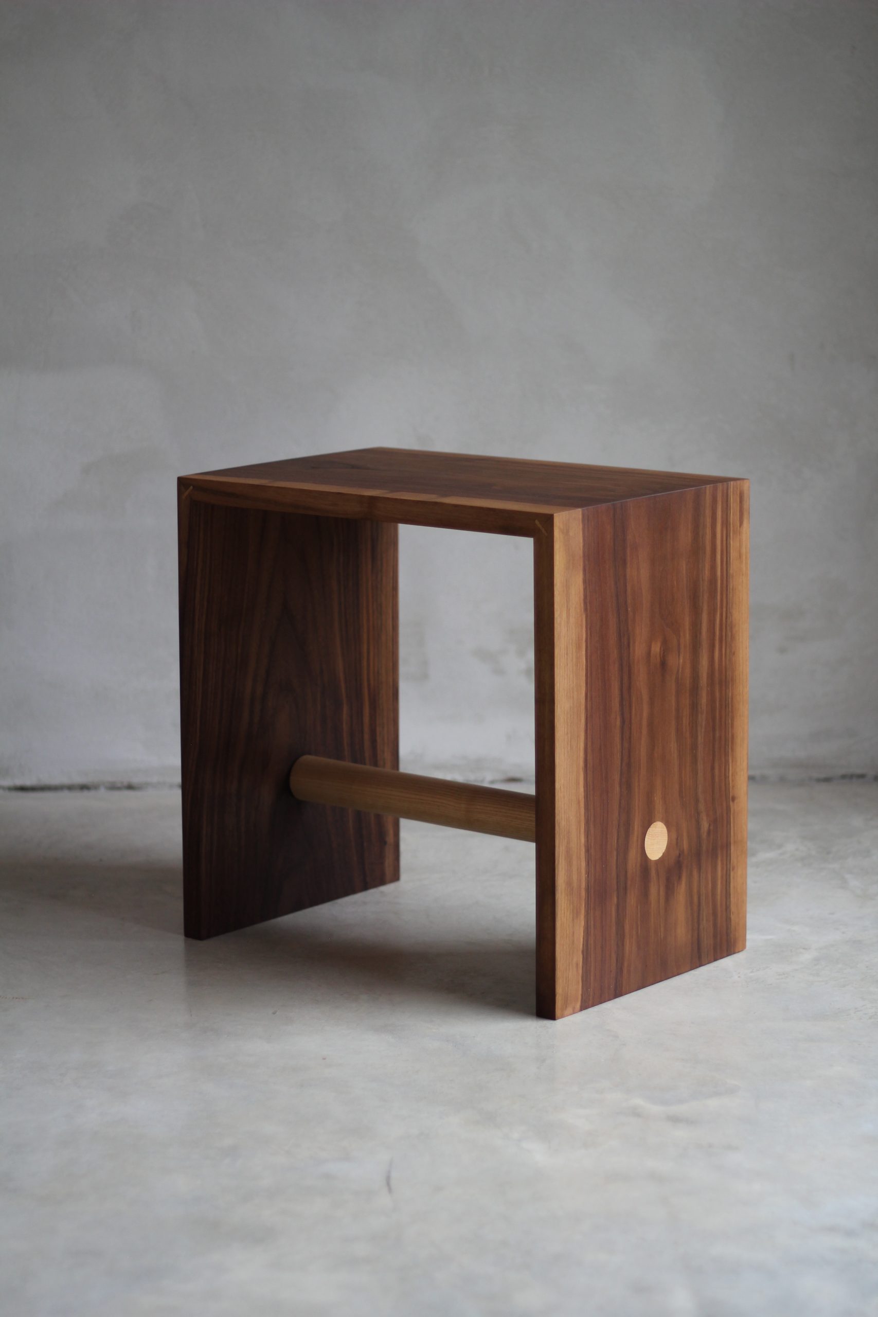 Banqueta compuesta por tres piezas rectangulares de madera maciza y unidas por un cilindro a contraste firmemente ensamblado.