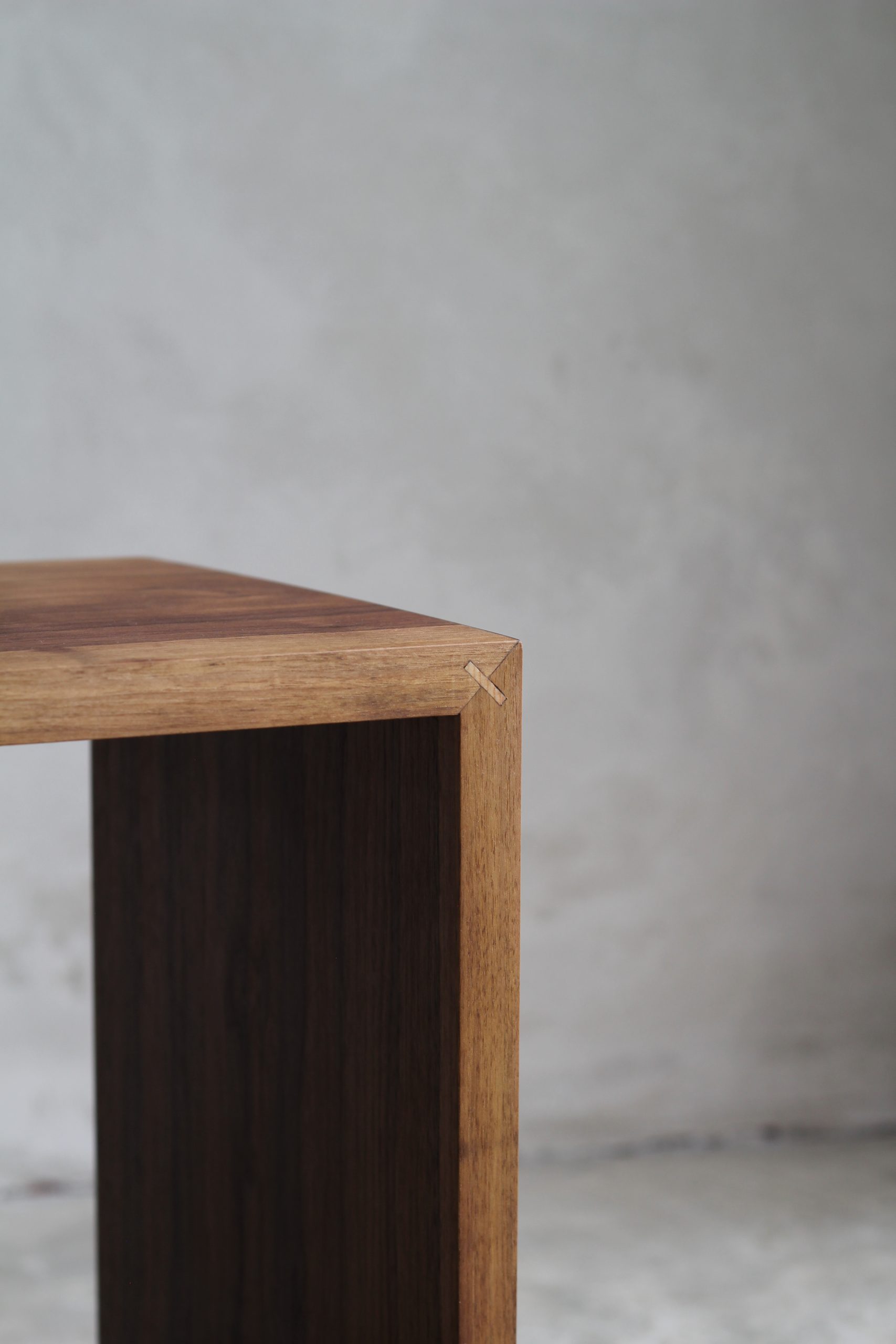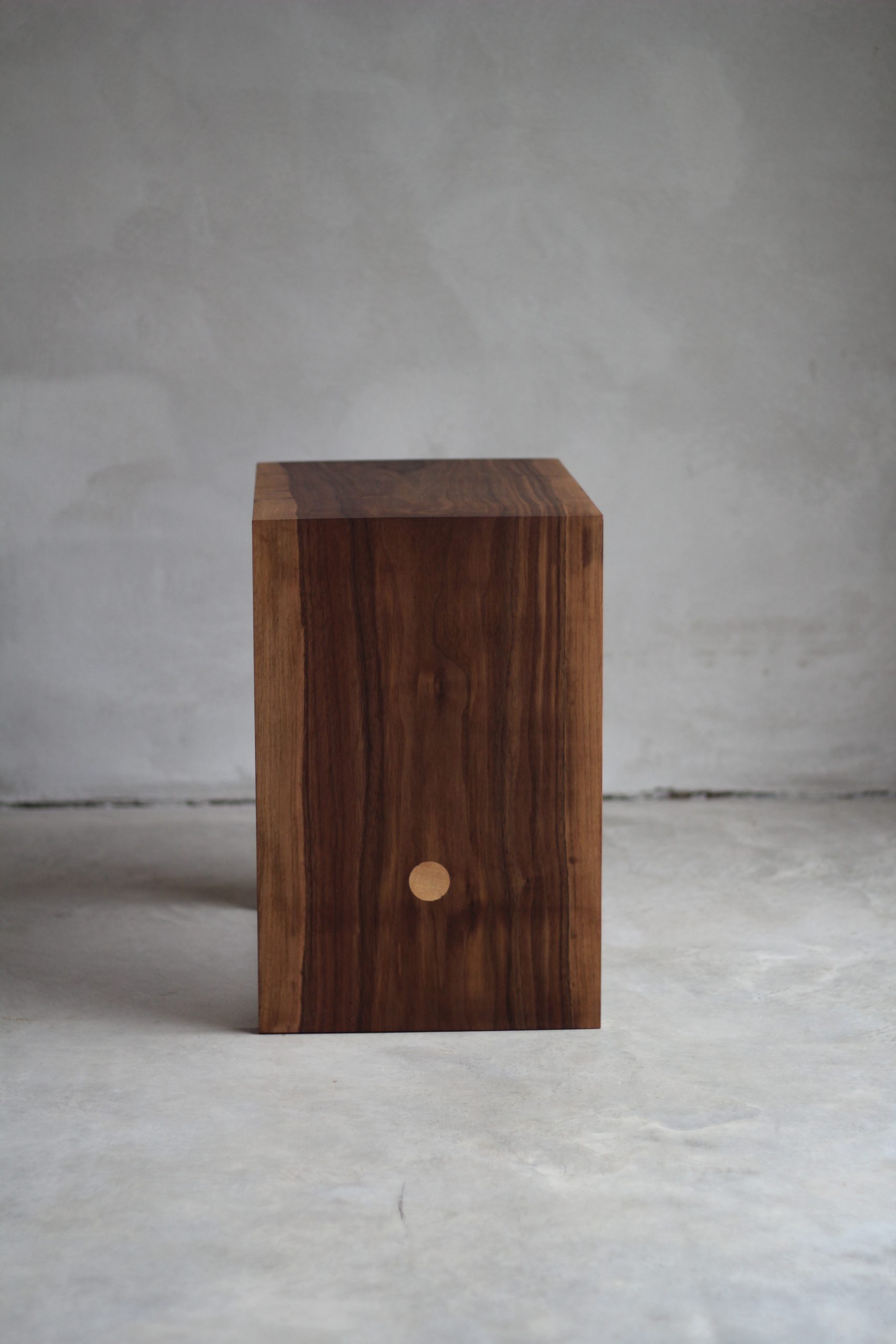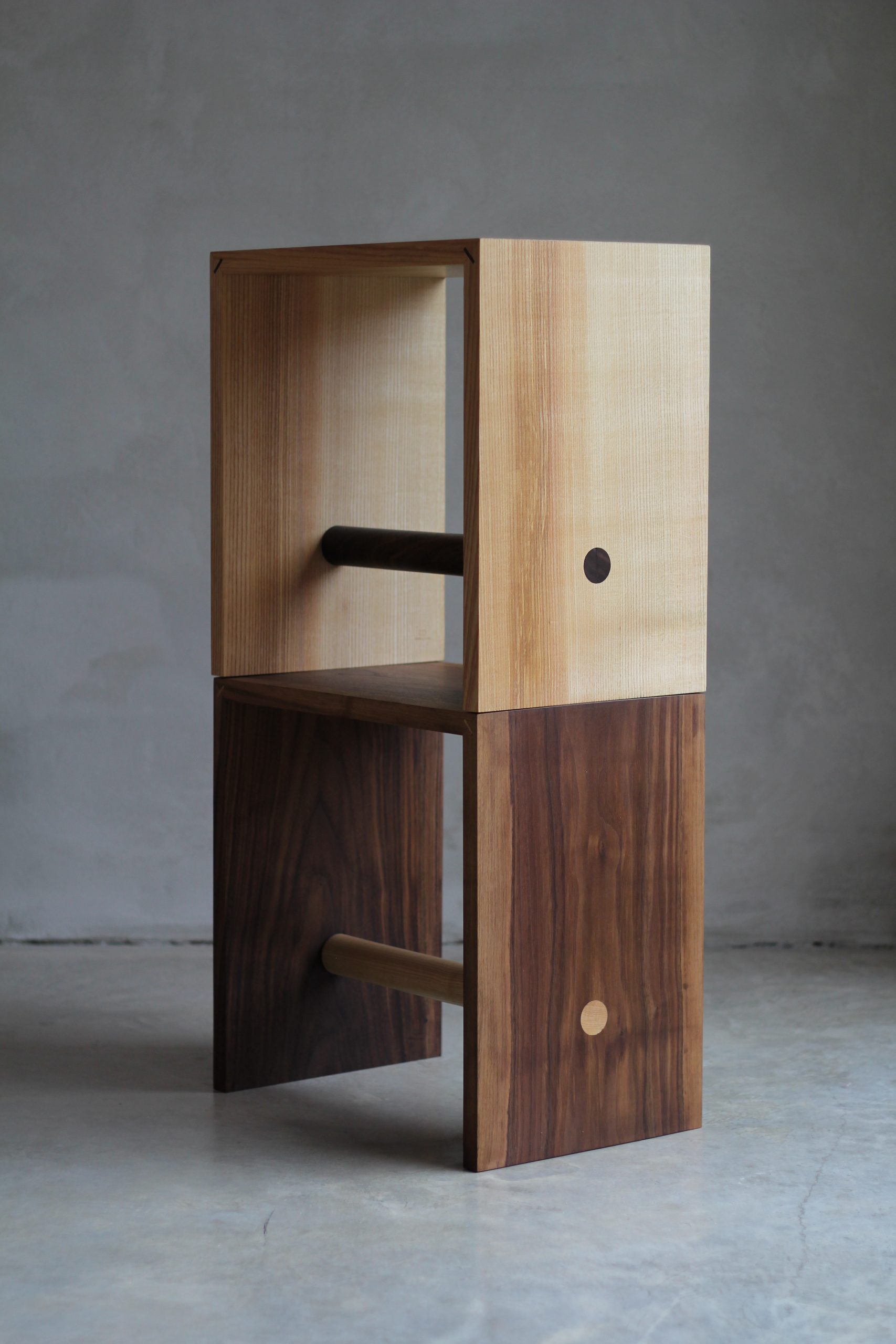 Banqueta compuesta por tres piezas rectangulares de madera maciza y unidas por un cilindro a contraste firmemente ensamblado.